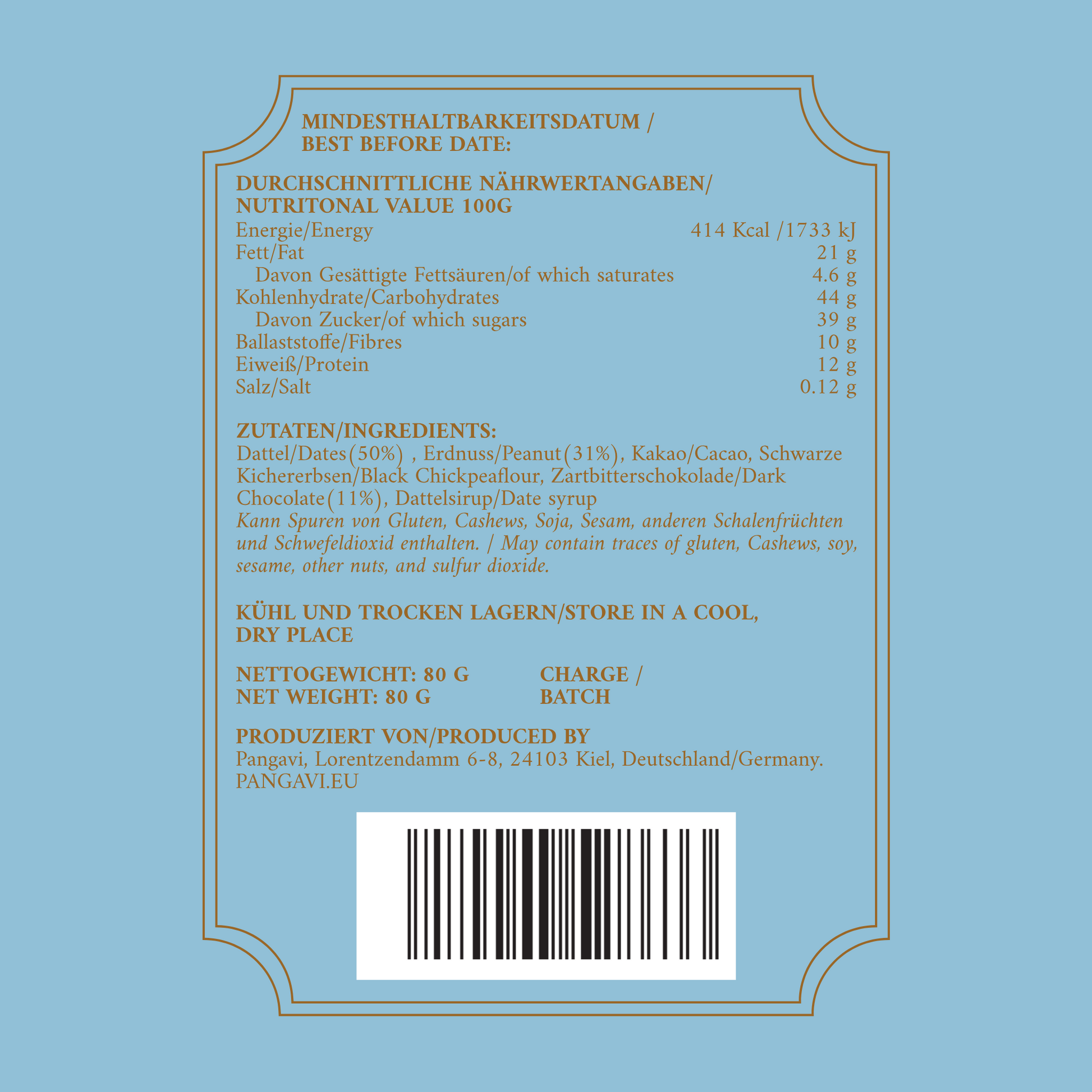 The combination of Peanuts, chickpeas, dates and dark chocolate provides a full-bodied, sweet and salty taste with a pleasant crunch.